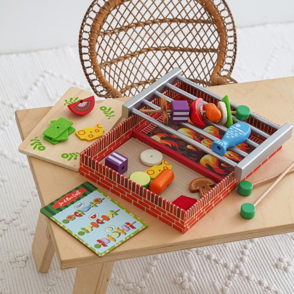 Wat is er leuker om te eten op een zonnige dag dan barbecue? Deze houten speelset van Djeco zit boordevol alle benodigdheden om heerlijk te kunnen barbecueën. De set bevat drie spiesjes, een snijplankje, barbecue, grillrooster, een menukaart en stukjes vlees, vis, en groente om op de spiesjes te doen. De speelgoedartikelen zijn gemaakt van FSC hout uit duurzaam beheerde bossen en gelakt in authentieke kleuren. Bekijk de handige menukaart en volg de recepten, of laat je fantasie de vrije loop. Alles wat je nu nog rest is een mooi plekje uit te zoeken en te genieten van het lekkere eten! Let op; deze set is gemaakt van hout en niet geschikt om echt van te eten.
